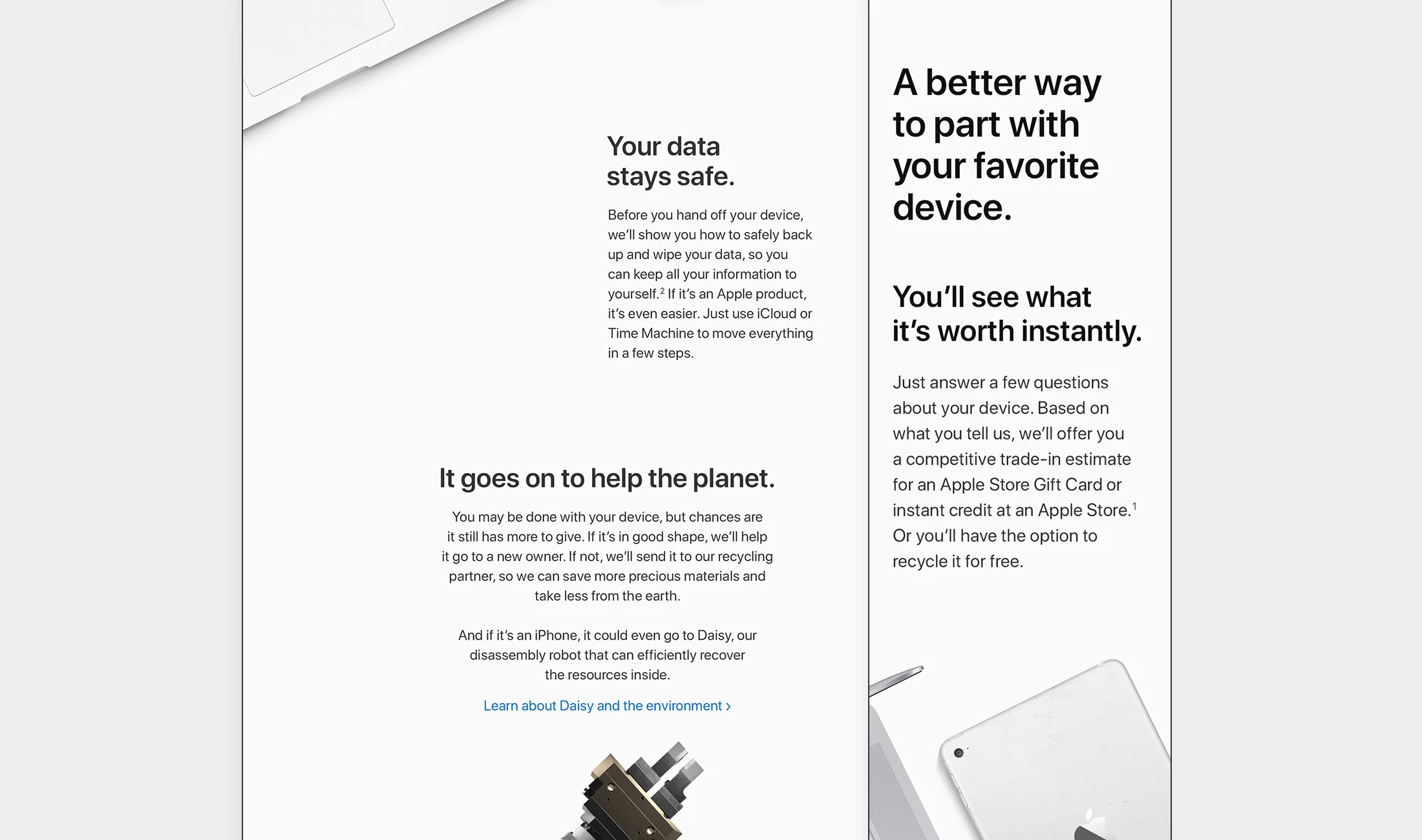 Now called Apple Trade-in, I was part of the inception of this project. We concept-ed what we wanted to say, how much we wanted to say, and how we wanted to say it. Ultimately they settled on one of the ideas that I purposed and as the program has continued to grow and evolve so has the page.